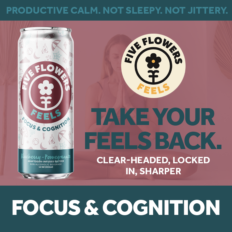Five Flowers uses premium ingredients in its beverage recipes. Filtered Water, Organic Cane Sugar, Natural Flavor Blueberry, Natural Flavor Pomegranate, L-Theanine, Lion's Mane, Citric Acid, Potassium Sorbet Sodium Citrate.